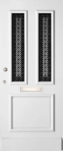 Deze klassieke voordeur heeft een romantisch ontwerp met sierlijke roosters en twee draairamen met facetprofiel. De roosters zijn standaard zwart, maar kunnen op aanvraag ook in andere kleuren zoals wit, groen, zilver of brons worden geleverd. De draairamen bieden niet alleen een esthetisch element, maar ook extra functionaliteit en lichtinval.